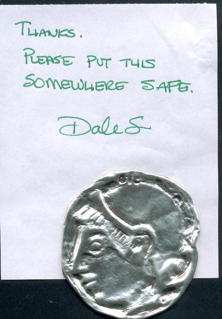 auction items I received my auction items today. The box is just a regular tile box,nothing fancy, but nice. Inside were a stone, pic below, an unopened letter to Sarah, below, a library card issued to Pat Dobbs,(very strange) and an admission ticket to the auction. I played around with the stone, it wouldn't show the image very well. It's just a grey stone with a (stamp?) of what looks like an ancient soldier on it. It's also very hard to see but it has the initials of SW on the back in gold.