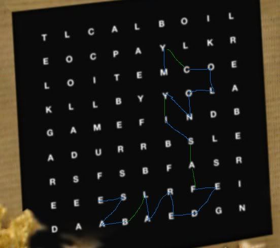 Okay, this may be streatching, but see if you can see what I see here when applying boggle rules of the letters just have to be next to each other to spell a word or sentence: