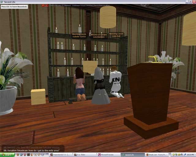 Okay. We're all sitting in this church and these "witches of serapis" have showed up. They're telling us to go find another church to find a third witch that will tell us something. Problem is that Second life's world is freakin HUGE. So yeah. Here's a little screenshot of one of the witches, lola marquez, praying.