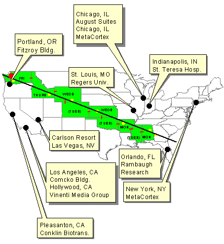 It's actually pretty interesting looking: If you ignore New York (and the Aquapolis ... I'll stick to a continental USA analysis for now), there is an interesting sort of symmetry (again). Portland-Pleasanton-Los Angeles x 2-Las Vegas is sort of a mirror image of Orlando-Indianapolis-Chicago x 2-St. Louis, reflected across a center point in Kansas. It is by no means an exact symmetry ... more of a sort of rough 'opposite and equal'. Having two buildings in Chicago and LA really reinforces that for me.