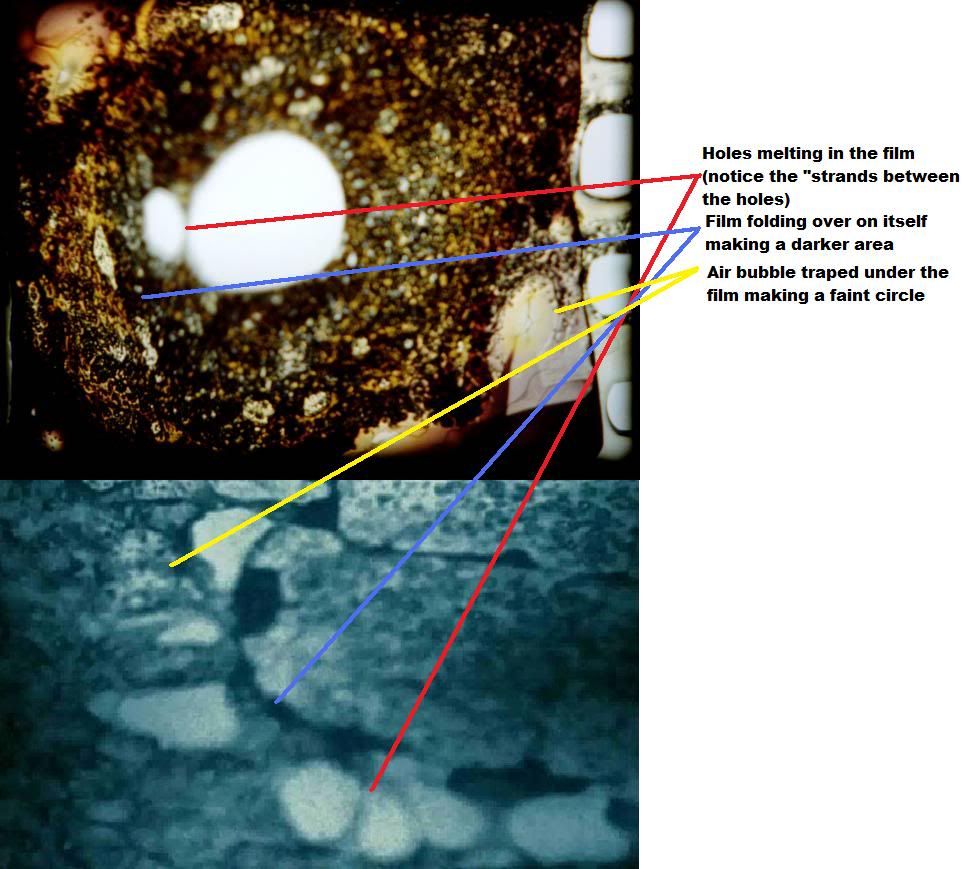 The film in this picture is more burnt but it shows the effect of film melting in the projector.The holes look the same, there are some darker areas on the left which also look similar to the image from the trailer and there are areas where you can see air bubbles trapped under the film making faint circles (like the one in the upper left of the trailer image)