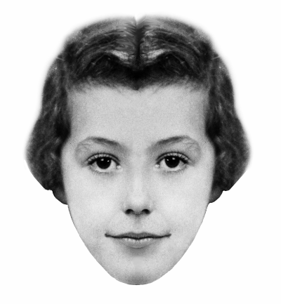 2) Starting from the assumption that the left side of her face is deformed / burned / bruised / etc... I am thinking that the photo they got the cover-up from (the right side of the photo, the one that's just a little bit lighter, and where the hair is completely different) is also a photo of her, a few years older. BUT they used the right side of her face, mirrored it, and put it over this image of her in her younger years. What we see as the left part of her face is actually the right, mirrored and photoshopped into merging with the rest. Also, the light reflected in her left eye is either: taken from her right eye and pasted in there as well OR is from her left eye in the original photo - which would mean that the left side is not ENTIRELY from somewhere else...