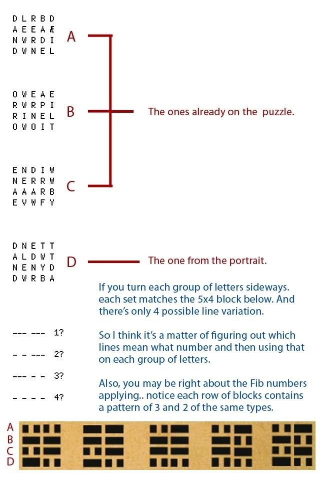 One thing to take note of is how the first block of text have a lot of the same letters as the block of letters the courier wrote on the portrait page, as well as the second block of letters... it's almost as if you could merge many of the rows of letters based on the same letters they share in the same order... but again, there's no lead from this either.. just more speculation.