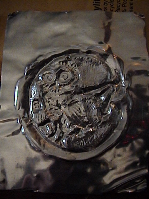 A piece of heavy grade aluminum or tin with the owl stamped on it.
