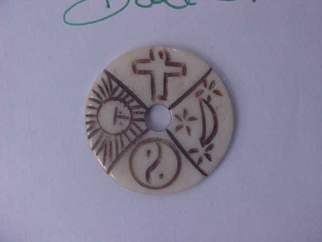 A plastic coin, or chip, slightly more than 1 inch in diameter, with a small hole in the center. There are four faces on both sides of the coin that mirror each other exactly, and separated in quadrants.