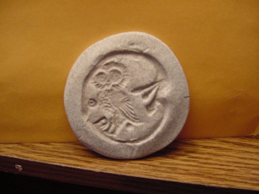 A handmade polymer clay disc that is about three or so inches around. It is imprinted with an owl and looks like the coin on the moon at the CTW page.