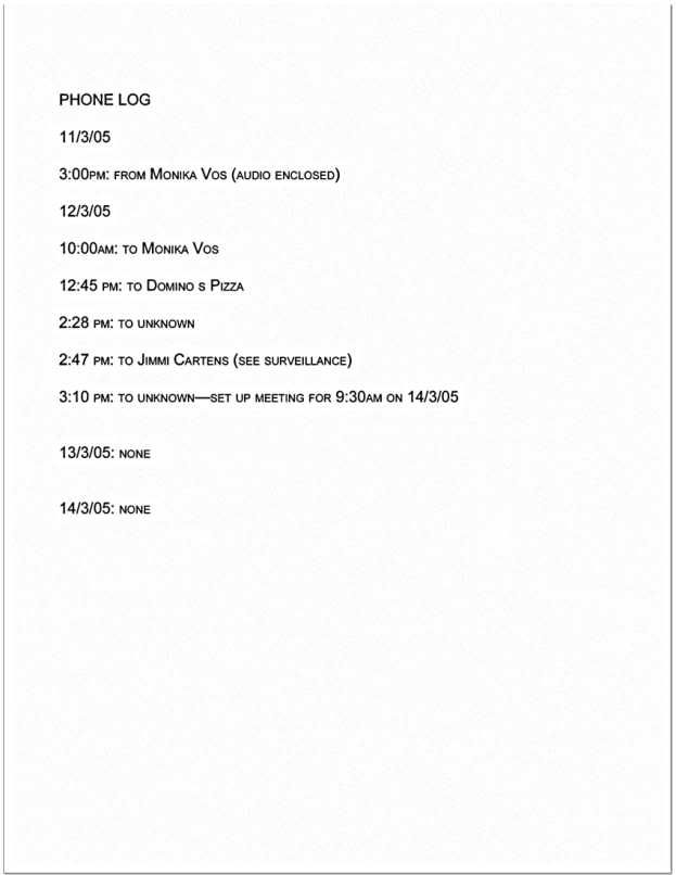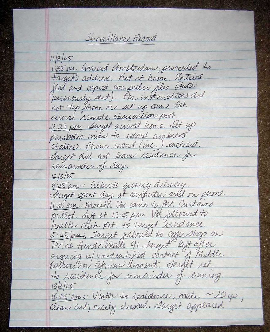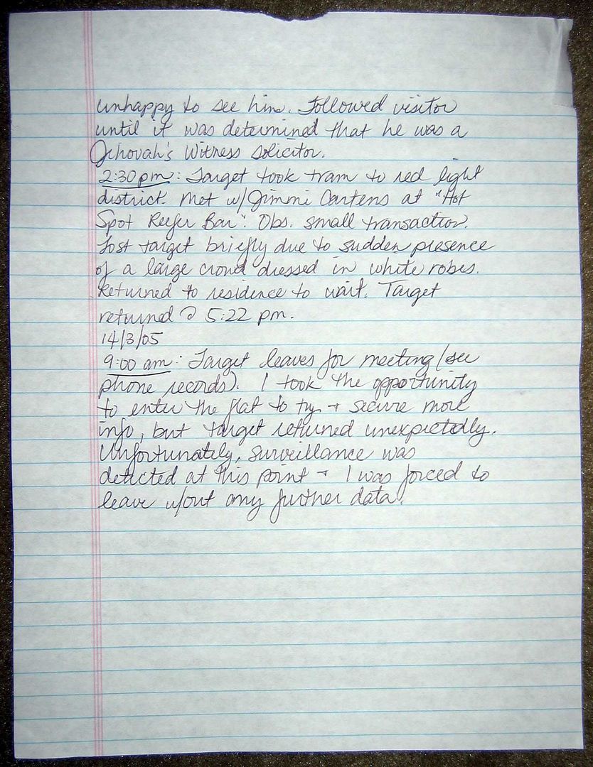 LOGP1.jpg, LOGP2.jpg - pages 1 and 2 of an investigator's log in trailing / surveilling Henk's activities.