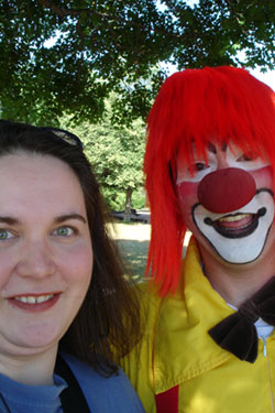 Oh oh! And it was so cute. One of the little kids that was there earlier came running back into the park up to us at the tree, and I said, "I see you have another taker!" and he turns, and the kid hands him this can of Coke he was carrying. "Oh, thank you!" says the clown, and I say, "That is so sweet! Aren't you sweet?" and the kid runs off.
