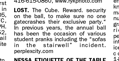 LOST. The Cube. Reward. security on the ball, to make sure no one gatecrashes their exclusive party." In previous years, the annual ball has been the occasion of various student pranks including the ''sofas in the stairwell'' incident.