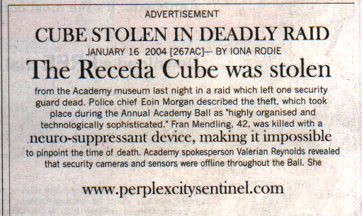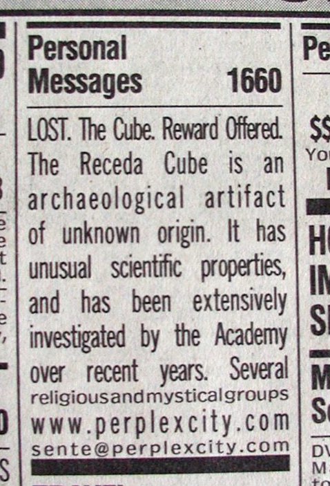 LOST. The Cube. Reward Offered. The Receda Cube is an archaeological artifact of unknown origin. It has unusual scientific properties, and has been extensively investigated by the Academy over recent years. Several religious and mystical groups www.perplexcity.com senteSPLATperplexcity.com