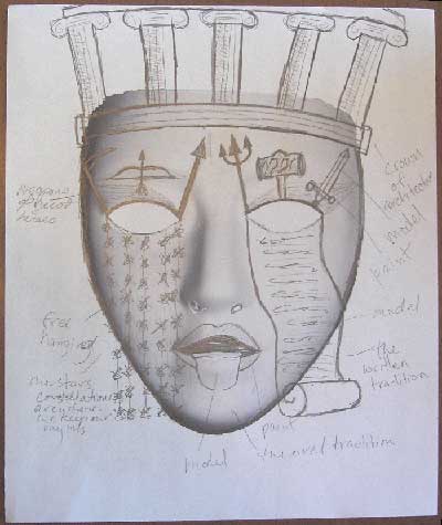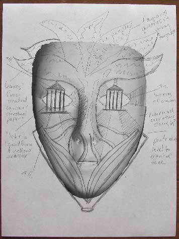 On the other side of the face there's a notation "free hanging" and then something about "crystals." I think these are Sarah's notes on how she was going to handle the design. I can't make out what it says about the symbols over that eye or what is said in the rest of the info on the "crystals."