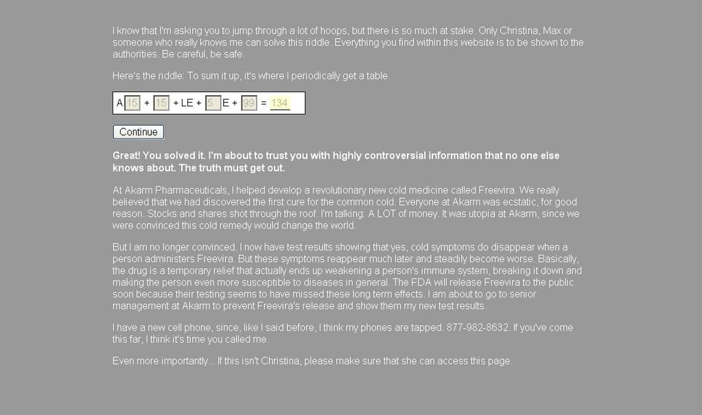 requires a username which is given to us by the wife, and then a password, which can be deduced from the clues given. Then tomorrow it will ask for another password. Some people have already enetered that, giving evidence of skipping ahead. It could be possible to associate a cookie fromthat site with a cookie form the original site & that username. Again, not judging, do what you do, I was just wonderedif anyone else is concerned about it, that's all.