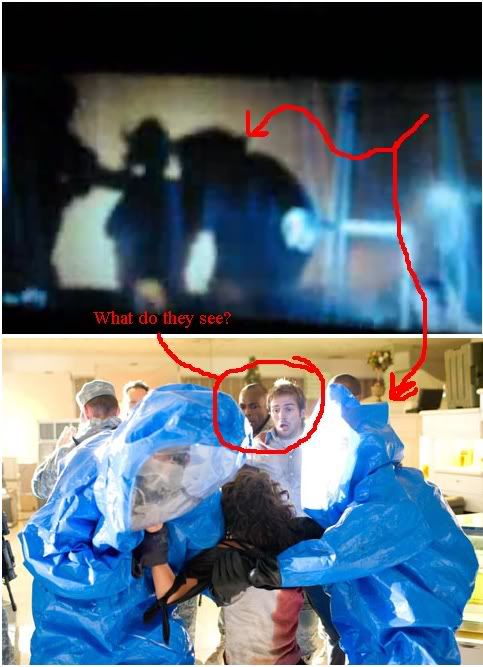 Ok, so lets say that scene IS of the two guys in the hazmat suits holding her down....I highly doubt she actually "blows up" but to me it makes more sense that the second hazmat guy somehow stepped behind her to get a grip on the girl. Hence the reason we see a huge rotund object suddenly appear from her shadow.