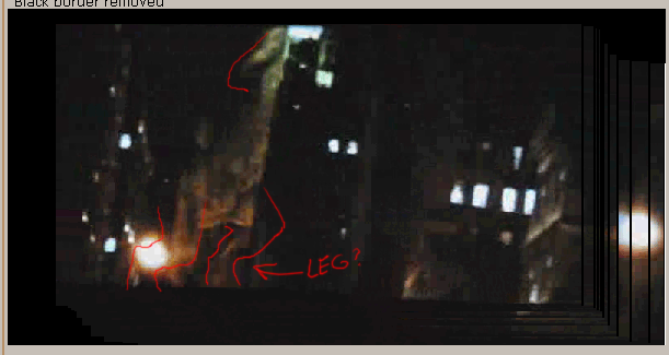 Upon review - it would appear that the "head" of the thing is looking up, almost towards the top of the building it's knocking into. But the big news (to me) is what the head looks like. Can anyone else see the definite whale-like appearance that I do? Tubular head. Long, flat "chin". It definitley has a whale head. Possibly a shark head, but no gaping teeth. Is that a small eye on the side of the head, too?