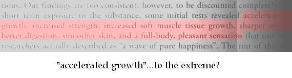 Also "short term exposure to the substance (sea bed's nectar), some initial tests revealed accelerated growth, increased strength, increased soft muscle tissue growth, sharper eye (?), better digestion, smoother skin, and a full-body, pleasant sensation that one (?) researches actually described as "a wave of pure happiness".