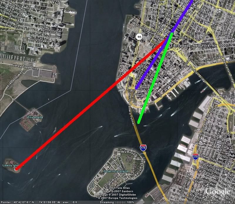 The red line is the angle from Liberty Island to Broadway somewhere near the Woolworth Building.