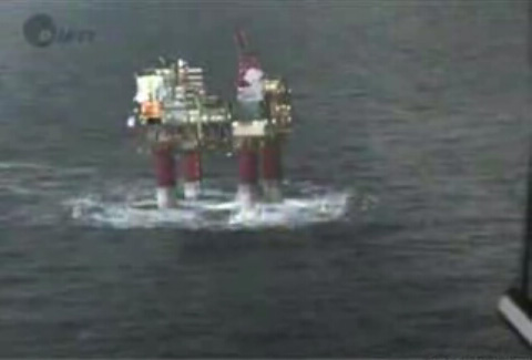 It's actually tension cords snapping. Those oil rigs have tension cords running up and down the pillars that hold them up and what you are seeing is the cords snapping and flailing downward towards the water. I think it may appear as bursts of gunfire because of the quality of the video. Also the scale of the size of the burst is impossible.