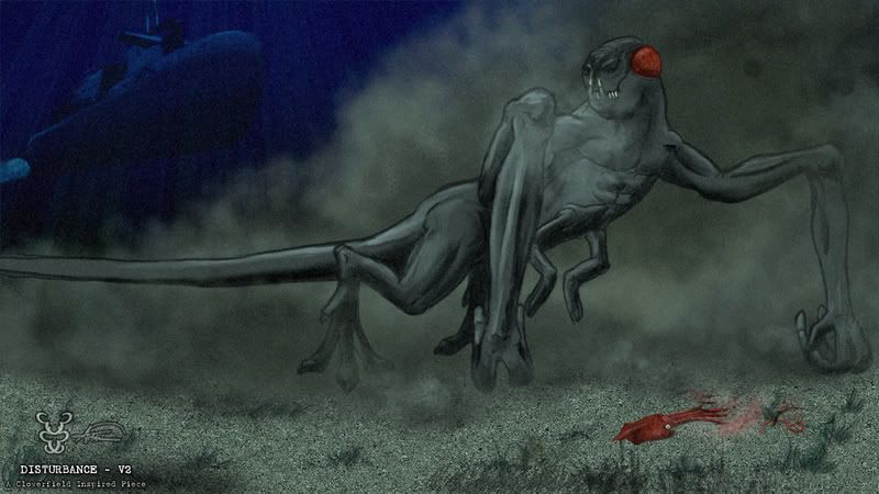 --Finally, there's one common trend I've seen in the whole 8 days or so since people started posting sketches and describing the monster: He's hard to describe. No one could pigeon hole him or label him as a big lizard, a godzilla, a dinosaur, a whale, etc. I think some real credit has to go to the director/artisans for coming up with something disturbing and pretty original. It was an ugly abomination, and I like it the more I see it. I think people that are saying the monster was 'stupid' (see slashfilm), haven't yet absorbed it as a whole yet. I can't wait till the concepts are distributed from the filmmakers, so we can see the details they were thinking of in the construction.