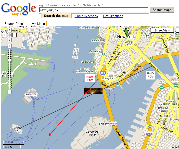 See how there are no buildings downtown? Hud would have a line of sight to anything in the water just past the tip of manhattan.