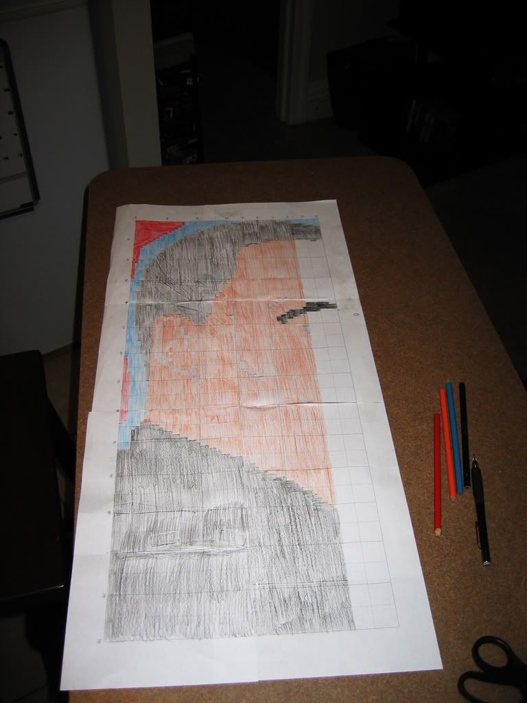 Half Finished This is halfway through the grid puzzle. Its definitely a portrait. Its gets a little more complicated where i stopped, but I stopped 90% because i dont have a pencil sharpener and I was tired of sharpening my peach and black pencils with a knife lol. Ill try to finish tomorrow. I know its hard to see the "grey" but it makes up the eyes and ear parts....so far no mouth looks odd to me. we'll see how it finishes. if anyone gets it before then, grats! good hard work