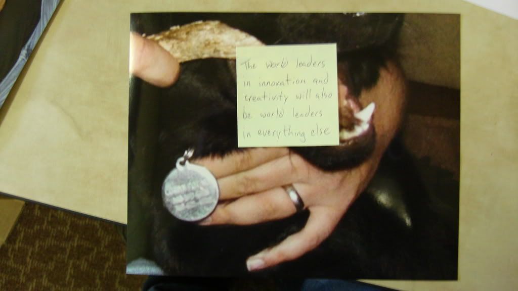 The post-it over the dog's face is a quote from Harold R. McAlindon, some management-type dude who wrote The Little Book of Big Ideas. I'm not sure whether the quote comes from the book. Honestly, though, I'm not sure if it matters-- perhaps the only important thing here is the common theme of the two quotes (innovation, creativity... dreaming?)