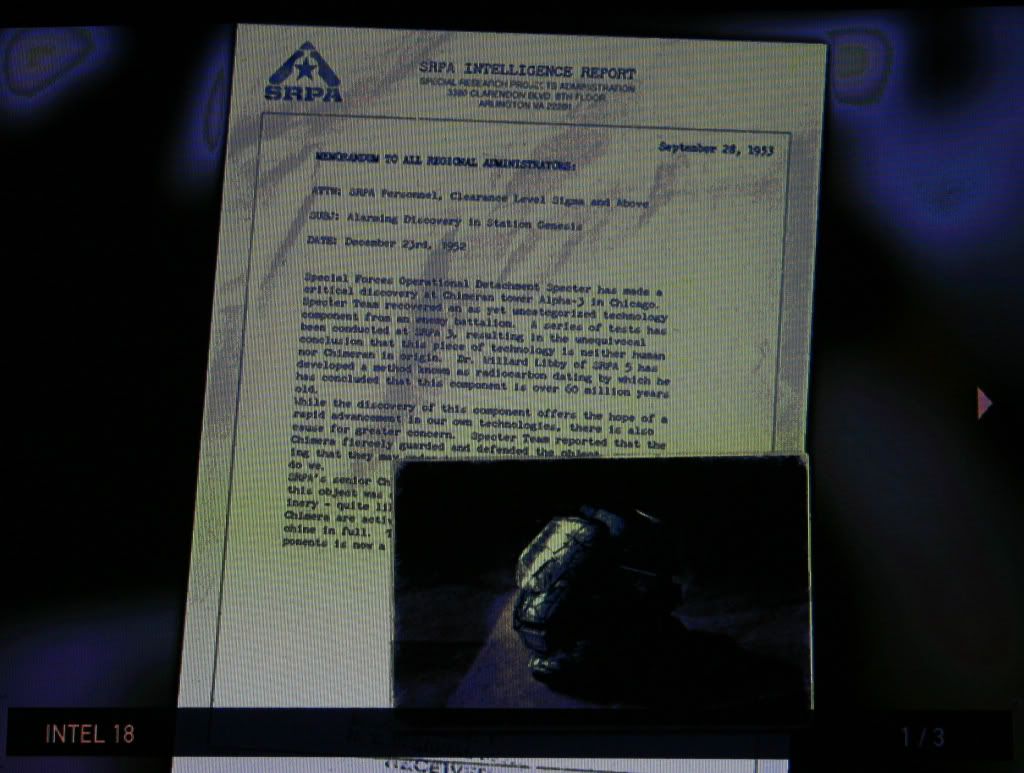 Special Forces Operational Detachment Specter has amde a critical discovery at Chimeran tower Alpha-3 in Chicago. Specter Team recovered an as yet uncategorized technology component from an enemy bettalion. A series of tests has been conducted at SRPA 3, resulting in the unequivocal conclusion that this piece of technology is neither human nor Chimeran in origin. Dr. Willard Libby of SRPA 5 has developed a method known as radiocarbon dating which by he has concluded that this component is over 60 million years old.
