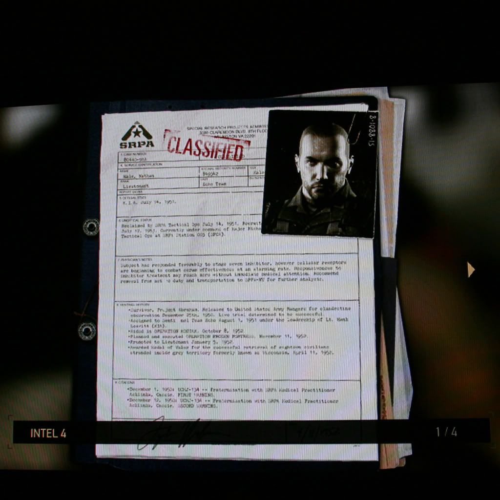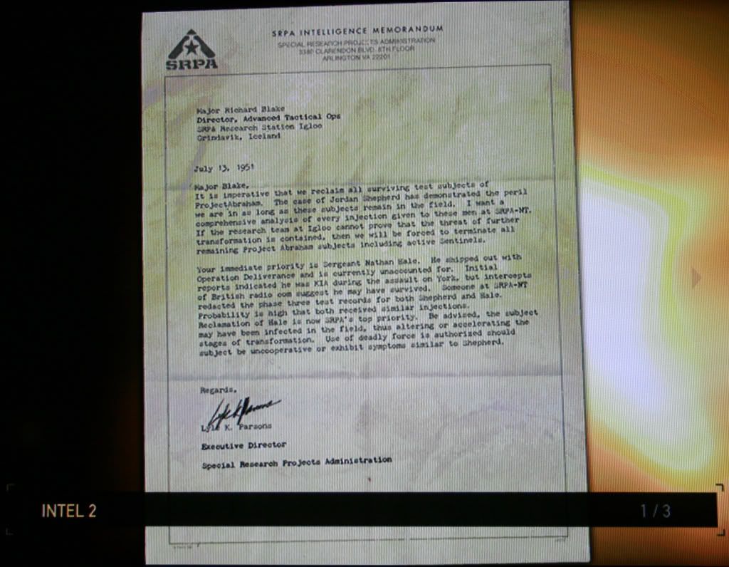 Your immediate priority is Sergeant Nathan Hale. He shipped out with Operation Deliverance and s currently unaccounted for. Initial reports indicated he was KIA during the assault on York, but intercepts of British radio com suggest he may have survived. Someone at SRPA-NT redacted the phase three test records for both Shepherd and Hale. Probability is high that both received similar injections. Reclamation of Hale is now SRPA's top priority. Be advised, the subject may have been infected in teh field, thus altering or accelerating the stages of transformation. Use of deadly force is authorized should the subject be uncooperative or exhibit symptoms similar to Shepherd.