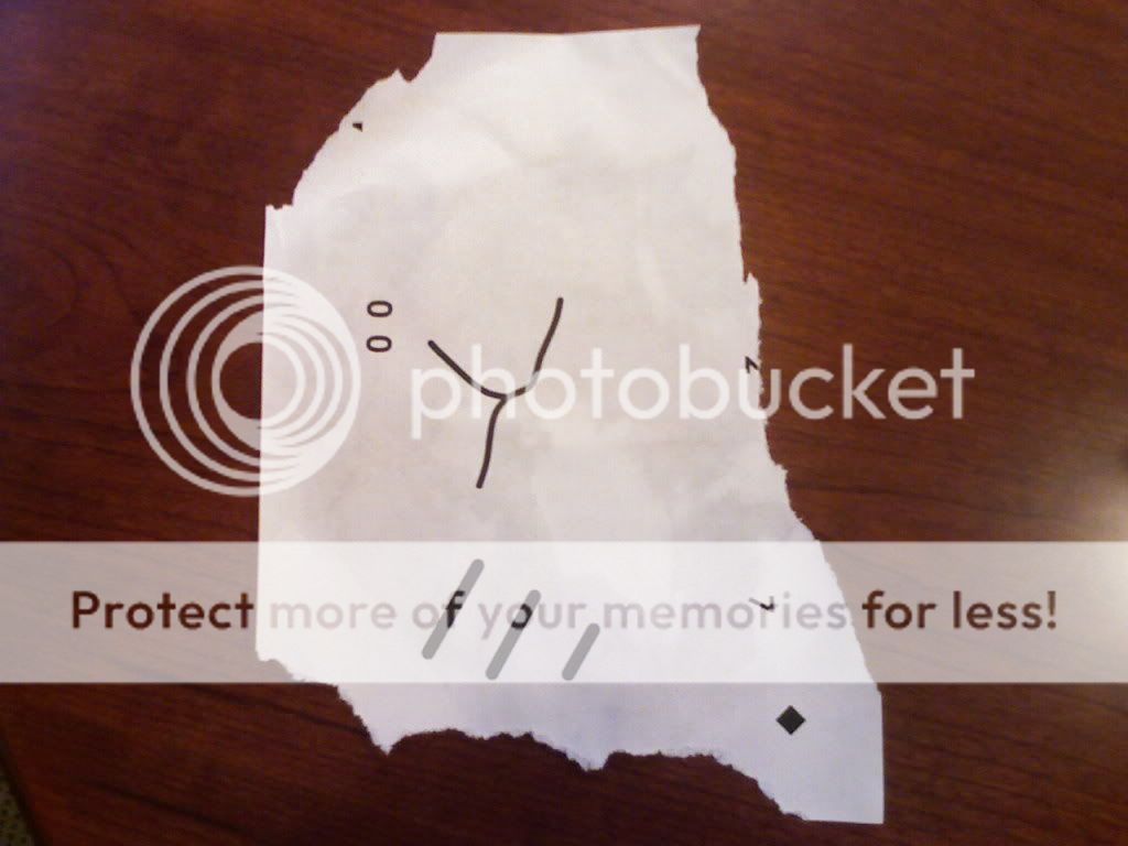The envelope was taped under the table and had a picture of a weird heart on it, I will also scan it when I get home tonight, I didn't think that would be important. The paper I posted the picture of is exactly how I found it. I was at Gratitude in the morning, in the greenhouse.