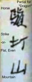 3. The chinese characters look like they were written with a marker. -The strokes do not look correct and some of the elements are partials. With this stated, the top characters look like "Horse" & on the right is the partial for "Dragon". Middle character looks like "Strike" or the character for "Flat" or "Even". Bottom is "Mountain" (this is the only one I'm basically positive about). Note: Allot of the time if the structure is followed by "Mountain", the characters represent the name of a Mountain. Visual reffy HERE
