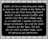 Kaleh, ich bin es leid draussen leben zu müssen. Ich schlafe in der Nähe der Stelle von der Dich diese Nachricht erreicht. Leute sprayen Graffiti und werfen hier ihre alte Möbel weg, es ist widerlich. I(ch) werde mich nicht länger verstecken. Sie sind mir doch sowieso auf der Spur. Die Zeit, die ich noch zu leben habe, kann ich genauso gut geniessen.