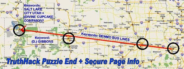 Not a problem. Taking off from your mention here of DENMO, I made up a simple straight line map from Missouri, through Denver and onward to SLC. Interesting how it's a very straight line. I placed the "cupcake co." in SLC as it was in the group of the 18 keywords, along with GIBBONS. I've added a theoretical bus line route that would jive with a "DENMO" context and connected it on to Salt Lake City, Utah. I wonder if the fire that the evidence photo is taken of will be located in SLC and "D. Gibbons" will be a POI (person of interest) of the FBI (Wedeck's team of Benford, Noh and Hawk).