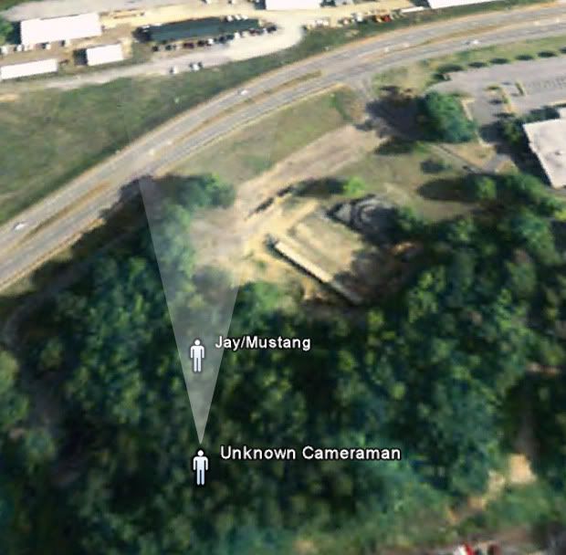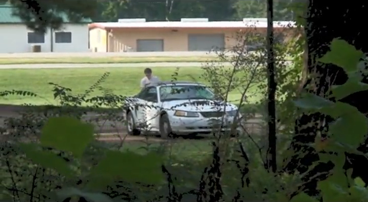However, my path for Alex was totally wrong, it turns out. They got cropped out by mistake, but the buildings you see in the background when Jay is getting the batteries out of the Mustang are along the road to the right. Which means, for them to be in the background of that shot, whoever was recording Jay was still on the trail and not by the bathhouse. So that pretty much debunks my theory unless Alex just started BOOKING and didn't stop.
