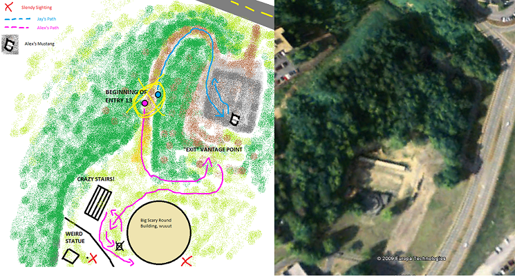 Here is the ACTUAL position of our stalker friend. He's nowhere near the bathhouse. And judging by the video, when he ran away after Jay finished at the car, he ran in the OPPOSITE direction of the bathhouse. So looks like Alex is out of the question, unless, once again, we take into consideration that the terrain wasn't meant to look like it does in real life in MH.