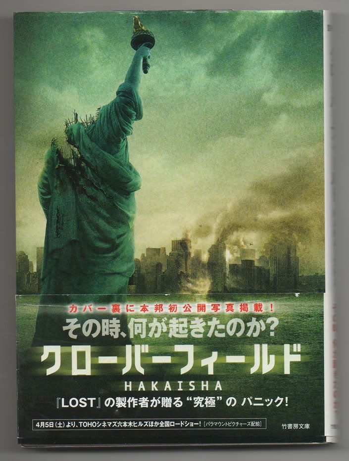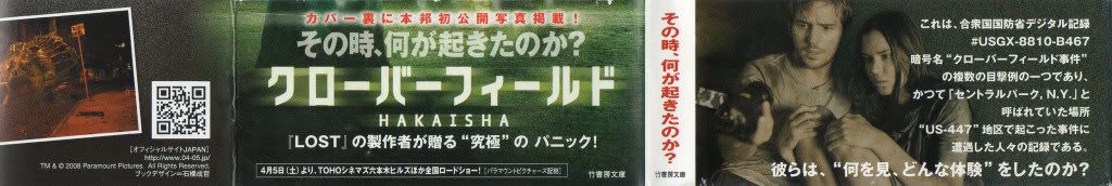 Japanese books are really cool designed. They have not only contents part and cover, but also an obi-strip, an information strip, kinda teaser about contents of the books. Here is the Cloverfield-obi-strip