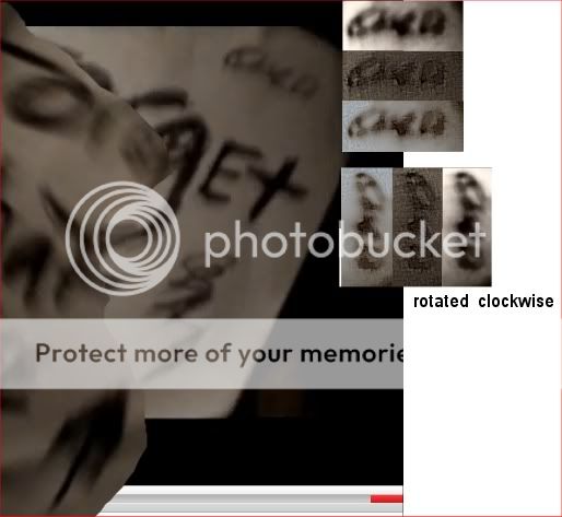 Played with contrast, sharpening, rotating/flipping/mirroring the little squiggly thing just above the arrow, and didn't come up with much. (Rotating and flipping it did give me something that looked like MNO in cursive.) The bit at the very top of the other page, was a little more interesting. [image] Sharpened and rotated it looks like it might say something (ALXE?) but I might have just been looking at it too long too late at night.