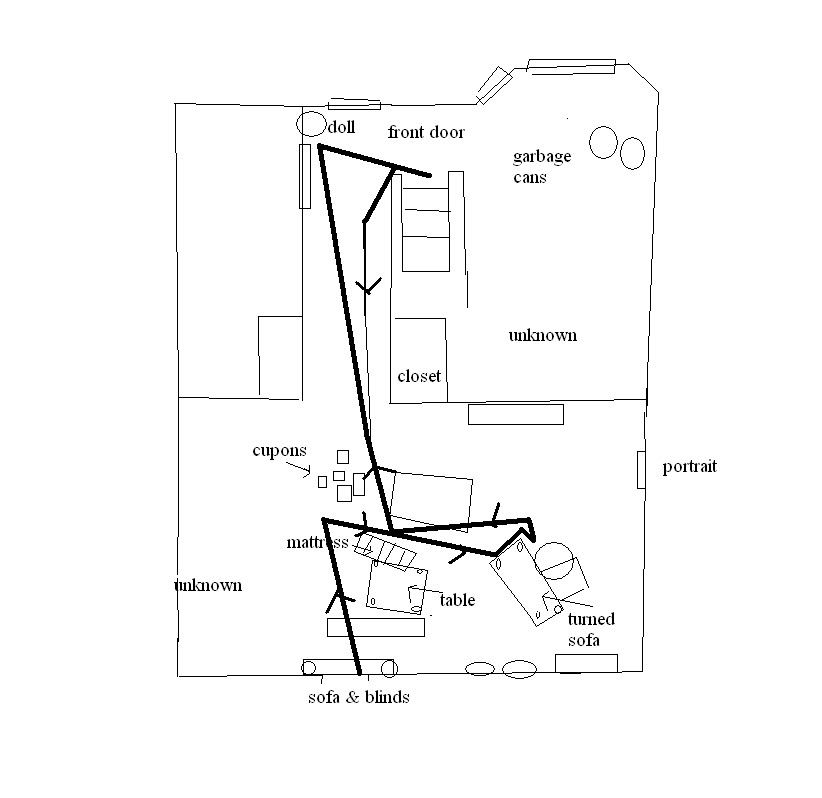 But if the kitchen is the room supposed to be the one with the garbage cans in #16 then it doesn't make sense, he would have to retreat to the couch with the blinds zone in like 1-2 seconds (I said the distance was roughly 7 meters), then turn around and have the blinds to his right, all while us not noticing these turns and runs he makes, it doesn't make much sense....