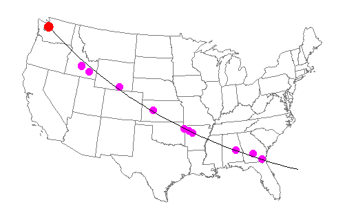 My line doesn't quite go through Umatilla, but there are a bunch of uncertainties about exactly where the line should be, and some issues of projection (there are no straight lines on the spherical globe ... the reality would have to be an arc along the surface of the earth, and depending on the map projection used it may or may not look like a line but rather a curve ... I've made these maps using decimal degrees/geographic coordinates whereas Beth would probably have done this on a printed map of the continental USA in some projection ... and curvature of the earth on the scale of the continental USA would be significant) so that doesn't surprise me at all.