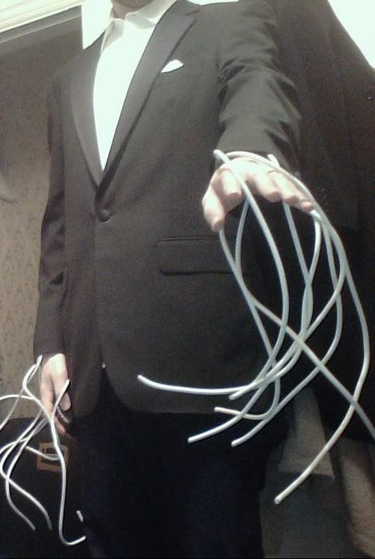It's not that impressive really, it's just a whosuit under a dinner jacket(I lack a black suit). The tendril are a 10m pc to tv cable I bought from Spar, cut into bits, and looped through watches. If you look closely you can see writing on it:D