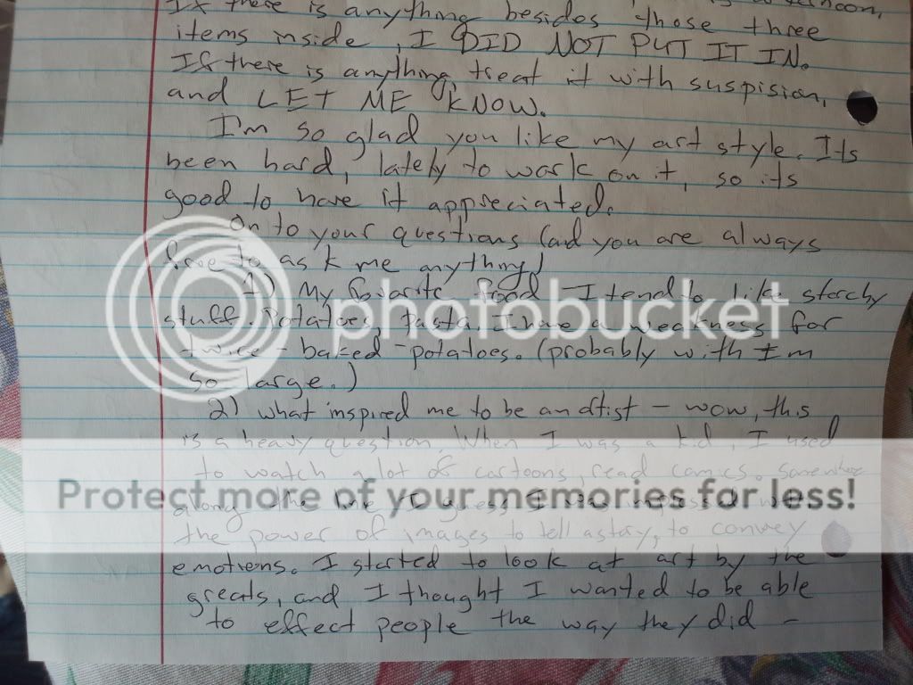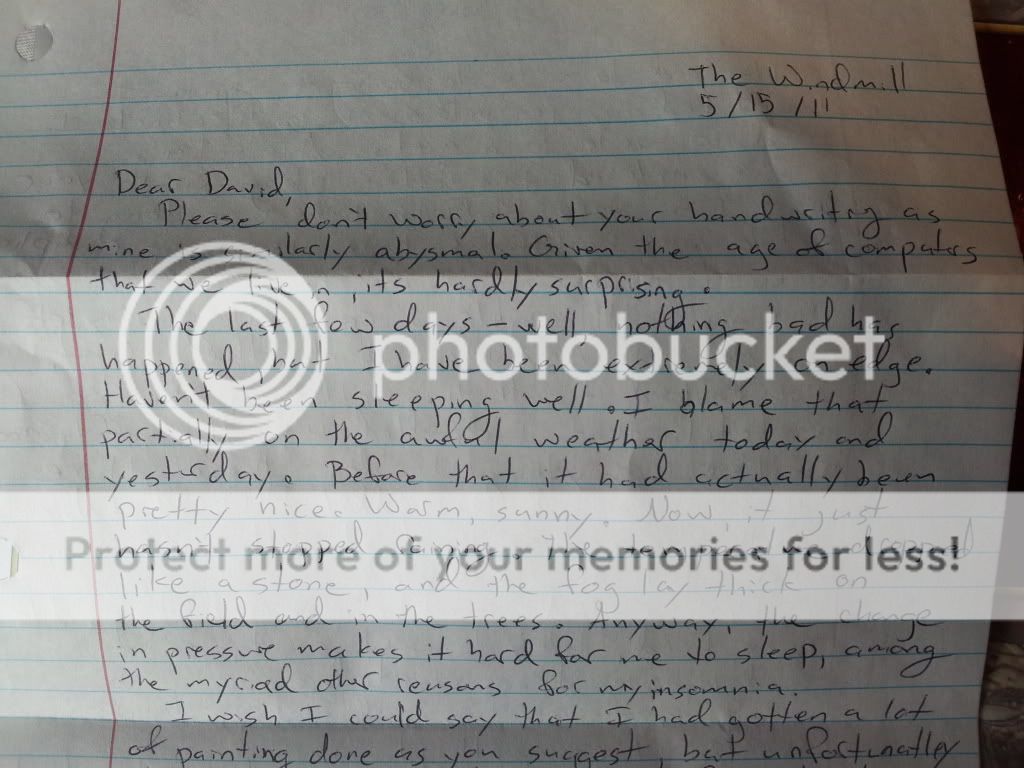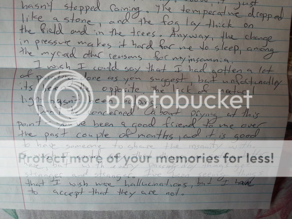 Um... I got a letter from Pickman with a lot of stuff in it! The letter is something I'm only sharing with the rest of the class because I realize there could be important details anywhere, but in all honesty most of my letter is pretty mundane. I'm going to get into more of the mystery in my next note:
