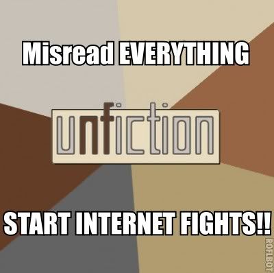 First of all: I know I'm being immature. I frankly don't care all that much, as I never really got into unfiction's community, so I don't know any of you personally. I'm frustrated with an issue or two, and as a result, I'm trolling. If you want to hate me, that's well within your rights.