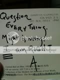 Seems question marks have been draw in the corners. And I have stickers that read "The Order" the only difference being that the "D" is drawn. Also the same symbol which has been drawn and filled in. Finally the picture did almost show a question mark so a dot was drawn on the bottom. The message on the back was this