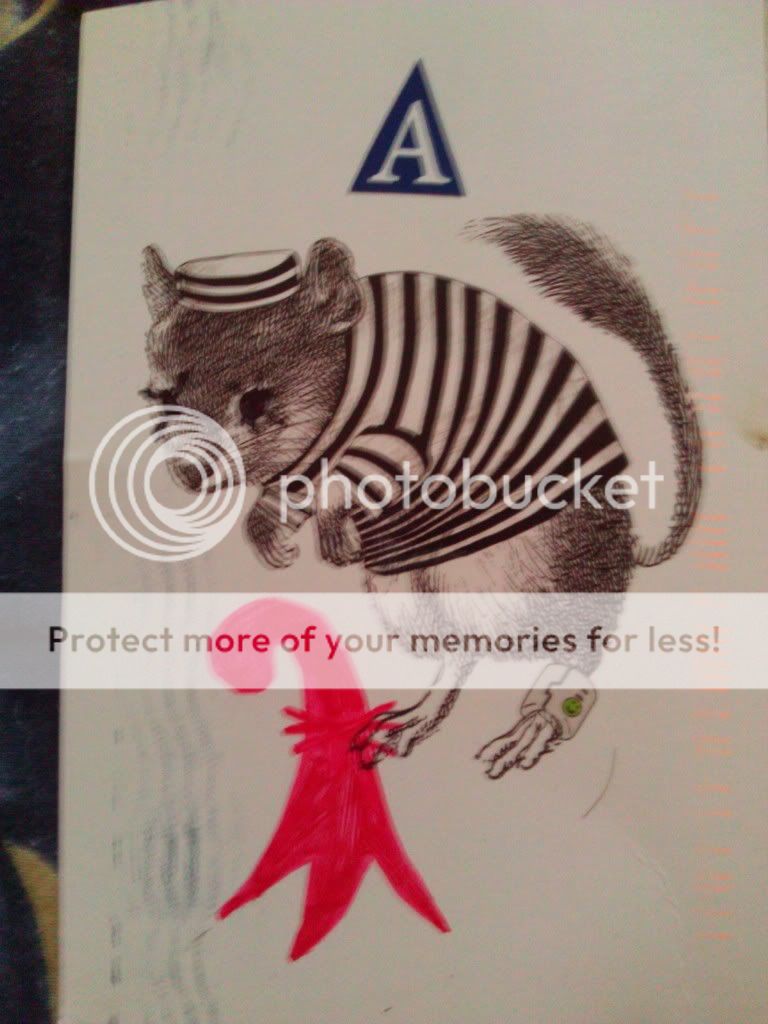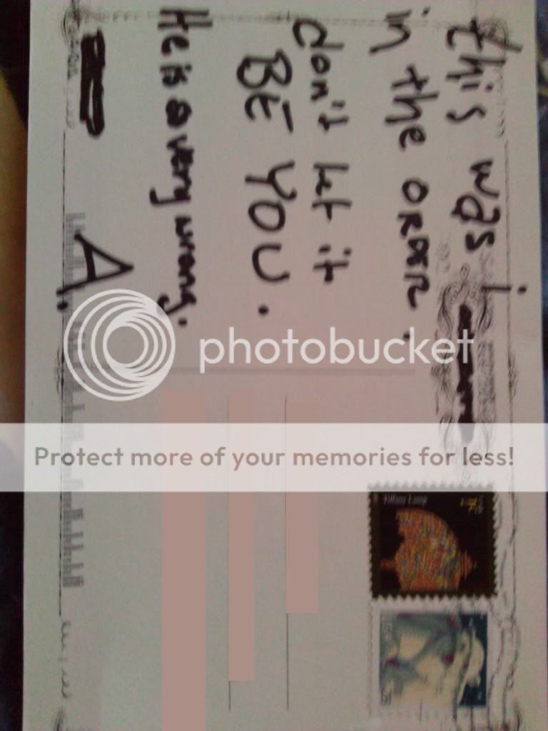 Thanks Cherrytree for posting pics. Today I was blessed with a postcard from the mysterious A. The white arrow is made with stickers and the mark next to the arrow is a scratch on the postcard.