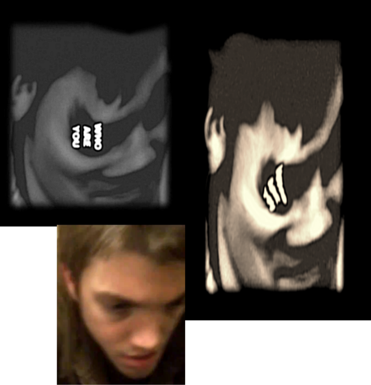 Face #4: 0:51 to 0:53. Again, the picture is rotated. Rotate the image 90° clockwise. Some say that this figure is Tim due to sideburns (or possibly Brian, if they think Face #2 is Tim).