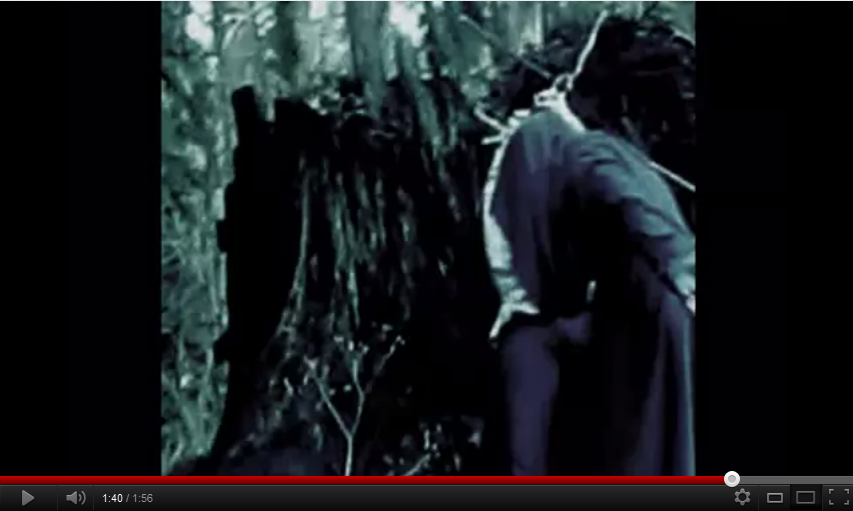 After the silent, black and white footage of the camera person traveling (by car or train?) past fields, trees and rivers, we get a bit of coloured footage (tiny bit of sound of their footsteps on the leaves) as they sneek about and watch a person (who VERY worryingly appears to be wearing Caught's new coat that he recently procured) aggressively arranging the body on the tree stump that Natalie found.