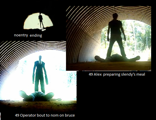 ^^This. Just...wow. I'm not 100% sure of all your evidence. There's a few more options than just Slendy and Alex, and all this looking at NoEntry has me convinced that it's not the same moment as 49 at all. I think that means that whoever it is as the front of the tunnel, the pattern implies that this sort of thing has been going on for awhile (more than this instance, at least). Still, I admire how your analysis doesn't resist this idea and instead just goes for the throat in all cases. definitely something to think carefully about.