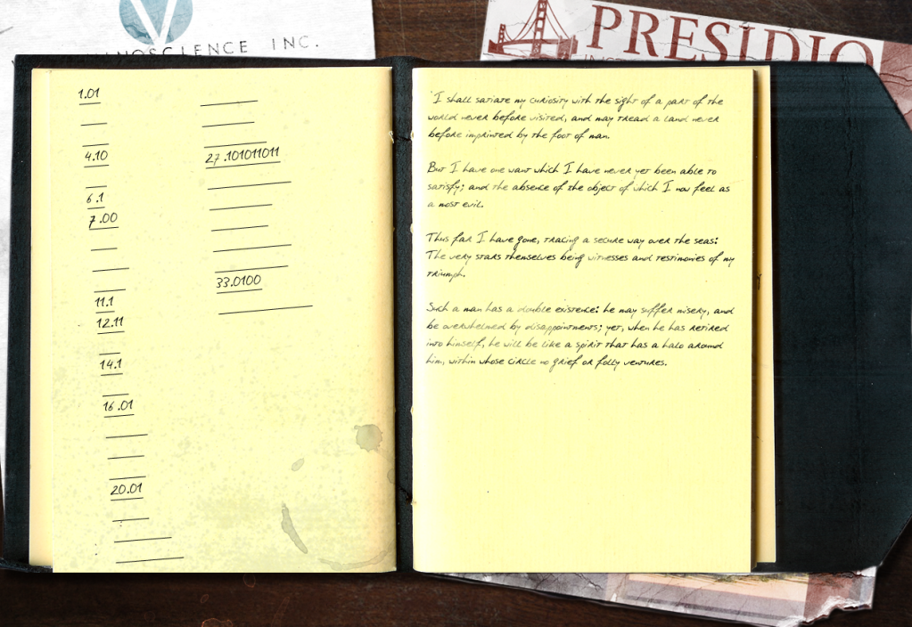There is some sort of quote, haven't looked it up yet. Written in a sort of journal or planner. On the left side is a list of numbers and several blanks. It looks like a list of the file names that have been sent, which means there are a lot more to come.