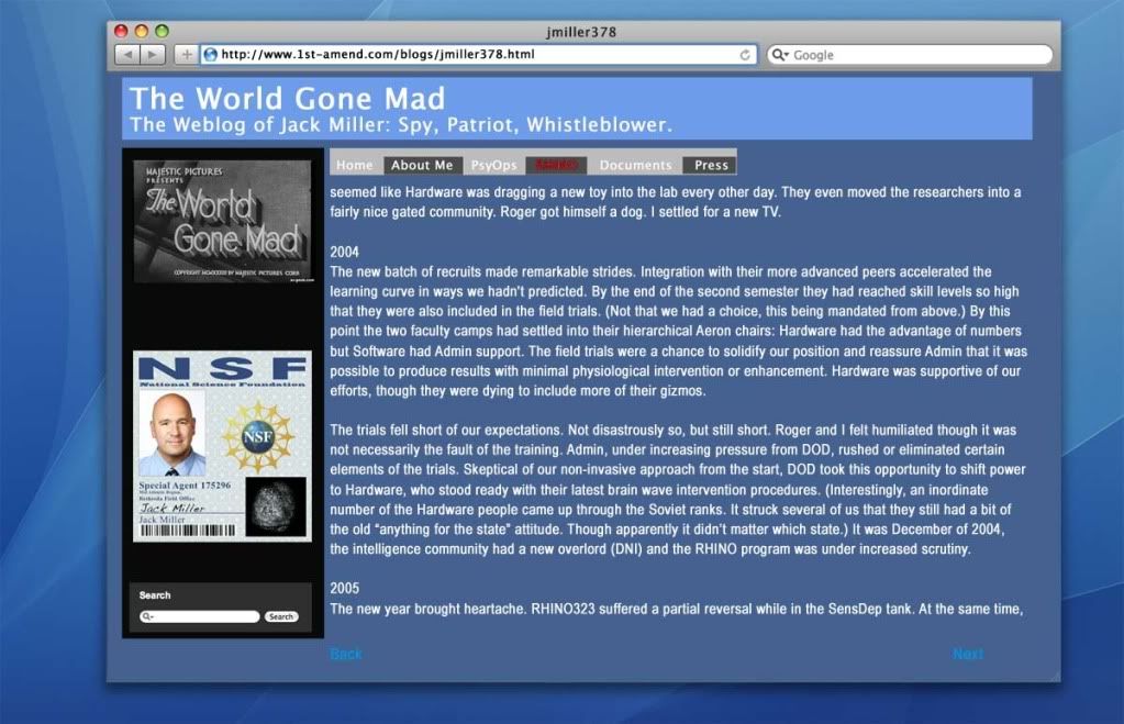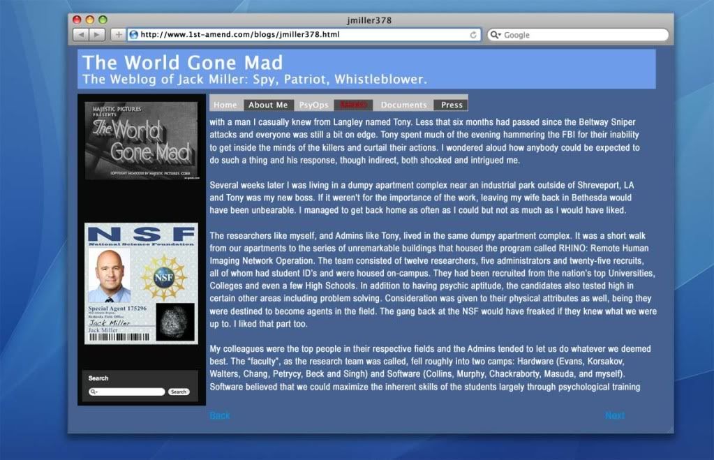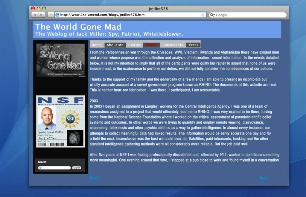 Another good one NS! I'm getting involved with the Jack Miller material. I think the RHINO program that Jack Miller was/is involved with is somehow related to Bristel Goodman. His story begins in 2001 with the emails to his wife. He is working at the NSF (National Science Foundation) and his brother has died in something related to 9/11. He becomes disillusioned with his job and begins working at the CIA in the Remote Human Imaging Operation (RHINO). The blog pages are some sort of history/confession: