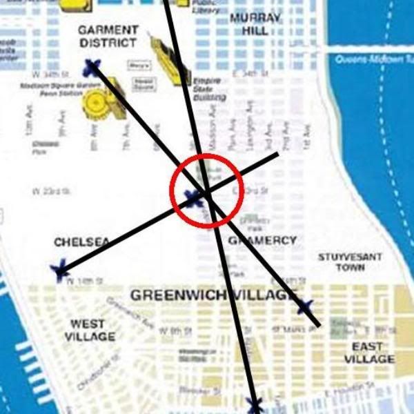 The X near the Garment District and MSG is the New Yorker Hotel I'm guessing as they mention it in this week's episode and it's where Tesla spent the last 10 years of his life in room 3327. Not sure if that's useful.