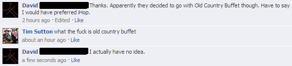 No, DHawk is the one posting on Tim's FaceBook. I've done nothing other than try to plan out an orderly dining schedule at Old Country Buffet.