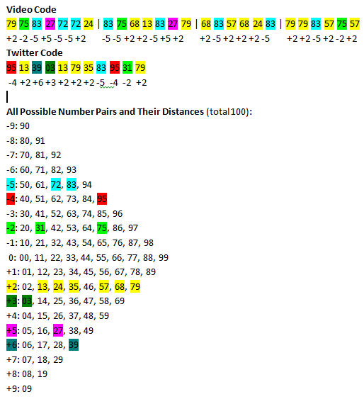 Speaking of which, I know nothing about ciphers and decoding this stuff, but it seems probable to me that we don't have enough information yet to solve this thing. If the pairs of numbers represent letters, then we didn't have all the letters we needed as of the video release, because additional, unique pairs of numbers were in the tweet. So, how do we know when we have everything? Do you experts just run all the techniques all over again when we get new pieces until it means something, or is there a way to guess what letters are missing, or what? For that matter, is it possible that what we've got is not the code at all, but rather the key?